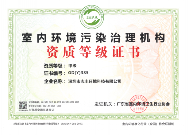 室內環境污染治理資質等級證書--甲級