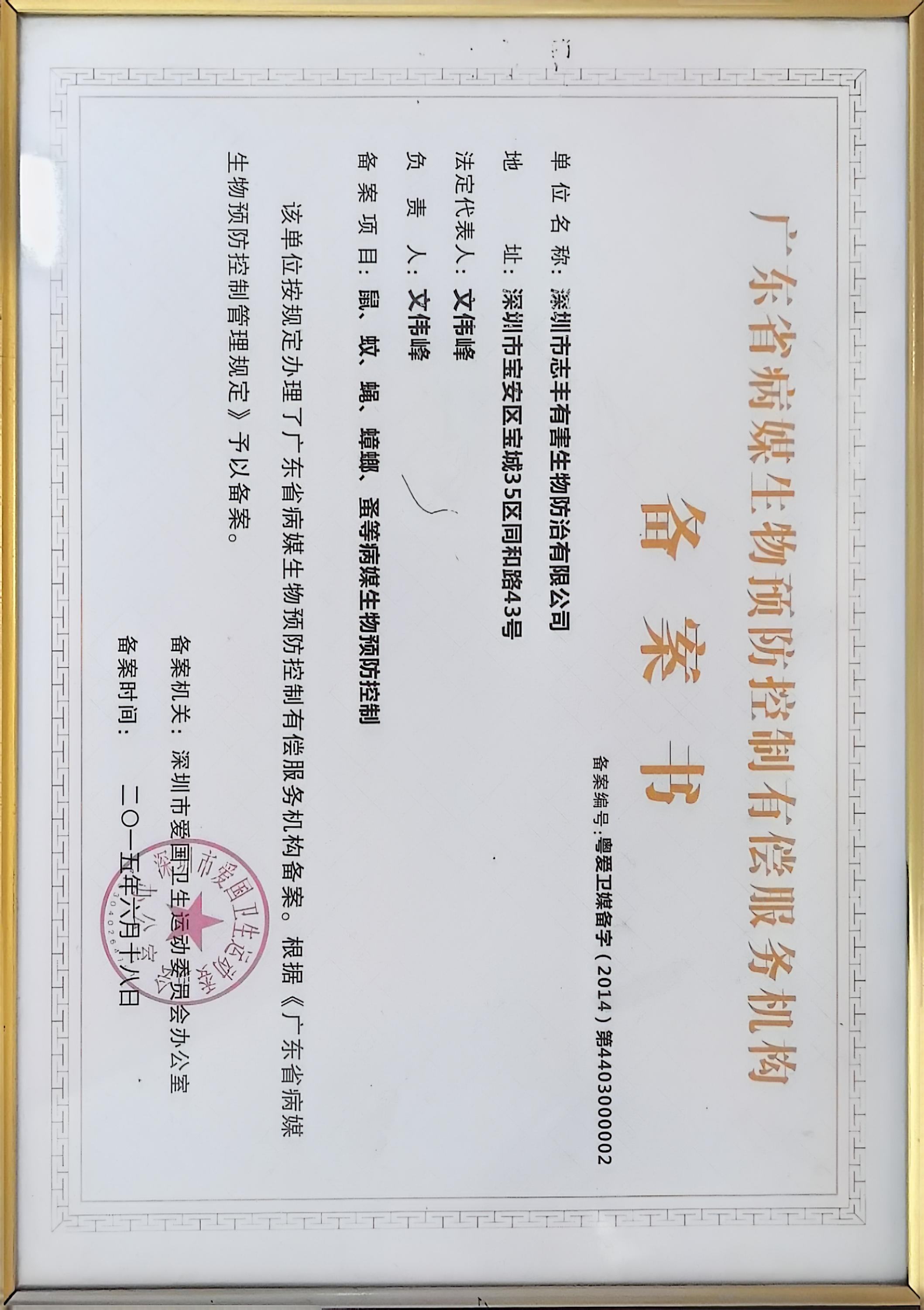 廣東省病媒生物預防控制有償服務機構備案書